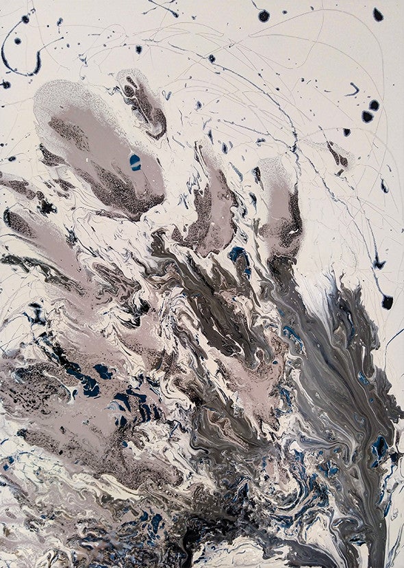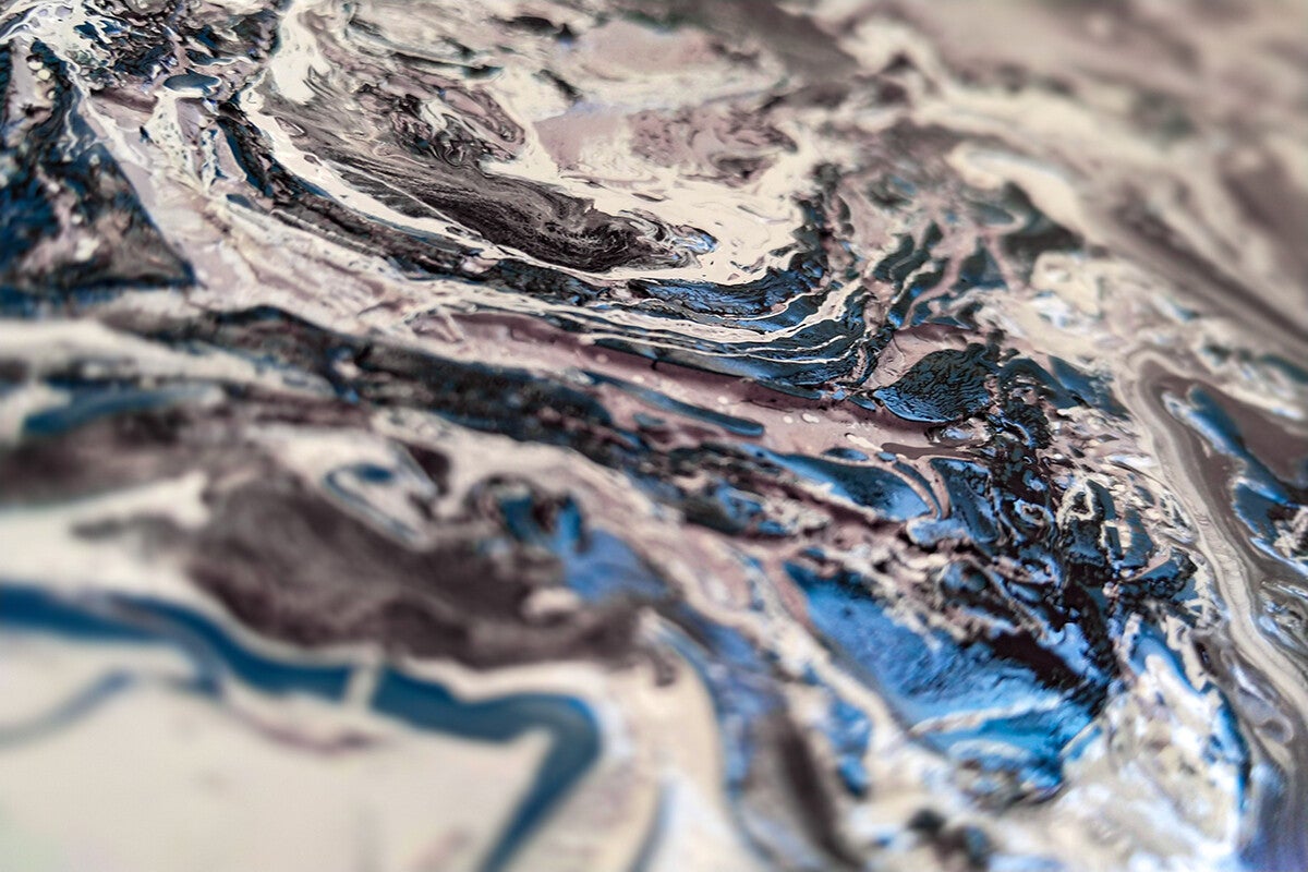Een witte basis met grote vlakken taupe en grijs zorgen voor een gezonde basis in dit schilderij. Blauwe rivieren met zwarte details zorgen daarnaast voor de benodigde spanning. Door oplosmiddelrijke lak te combineren met oplosmiddelarme lak ontstaat een hoogteverschil dat op sommige plekken wel bijna 2 mm is. Dit is goed te zien op de detailfoto hieronder (klik voor vergroting). Deze chaos gaat letterlijk alle richtingen op.